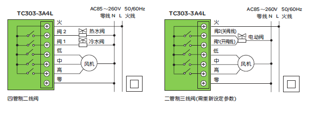 TC300系列通用型高档风机盘管温控器适用于工业、商业及家庭居室的温度控制,通过对房间温度的检测与设定温度的比较结果,控制风机盘管及电动阀的工作状态来调节室内温度,以达到舒适和节能的目的。TC300采用微电脑控制技术,大屏幕液晶显示,液晶显示状态有:工作状态(制冷、制热、通风)、风机风速、室内温度、设置温度等。按键有:电源开关/风速调节键(